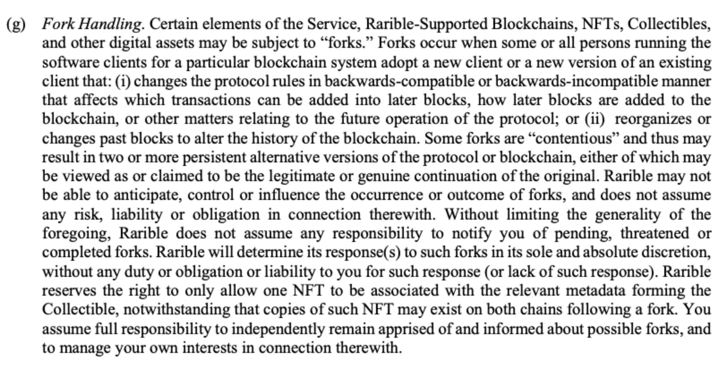 The NFT marketplace Rarible has an entire section of its Rarible Terms of Service, last updated September 8, 2022, called “Fork Handling.” While observing NFT copies can exist in the event of a fork, Rarible reserves the right to only allow one NFT.
