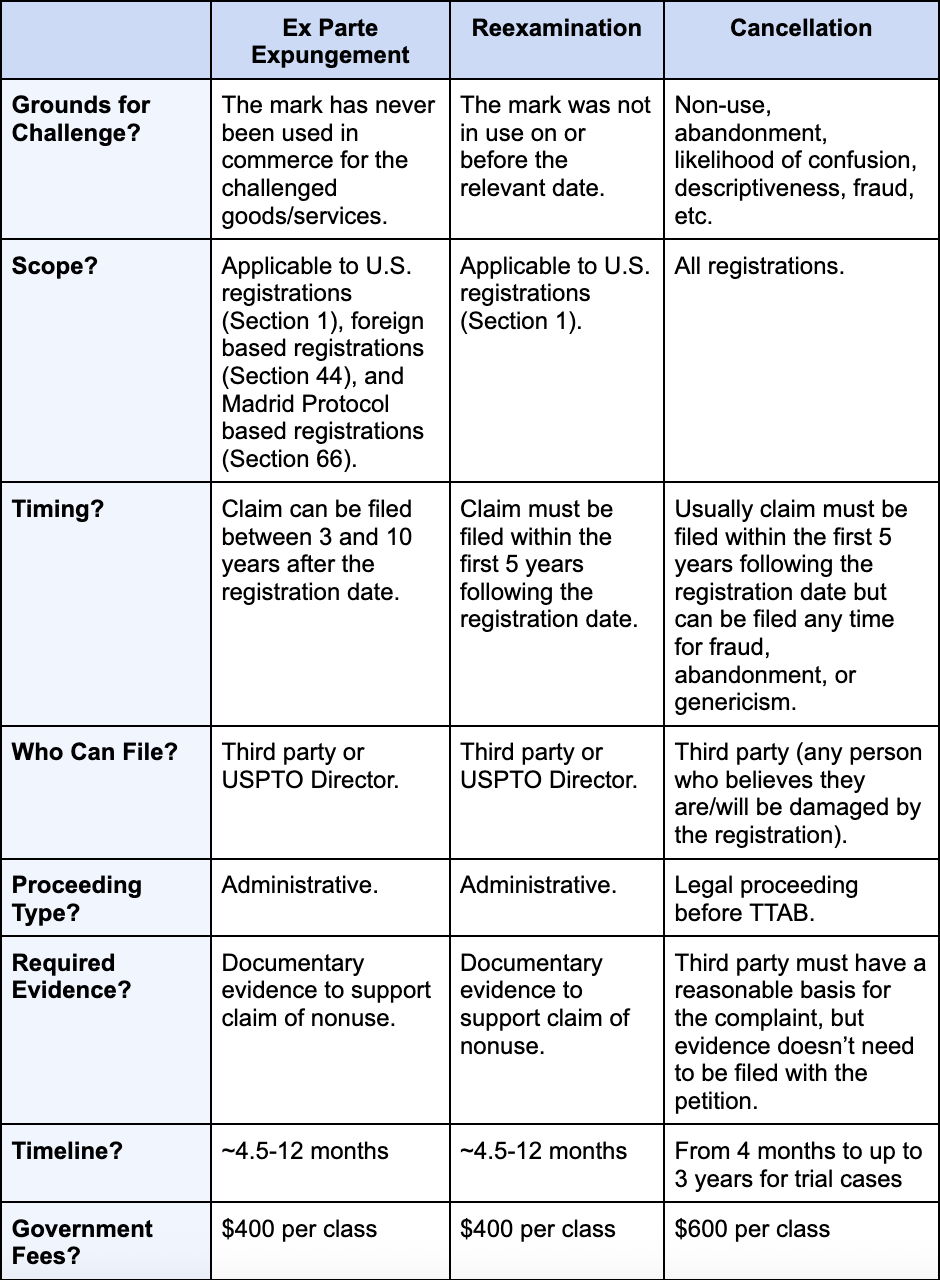The United States Patent and Trademark Office (USPTO) offers several mechanisms to challenge U.S. registrations. Among the most recent tools are “ex parte expungement” and “reexamination” proceedings, which were introduced under the Trademark Modernization Act of 2020 (TMA) and made effective December 18, 2021. Additionally, there is a “cancellation” proceeding before the Trademark Trial and Appeal Board (TTAB). While these proceedings aim to clean up the register, they differ slightly in terms of grounds of challenge, scope, and timing.